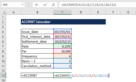 ACCRINT(issue, first_interest, settlement, rate, par, frequency, [basis], [calc_method])