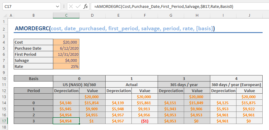 AMORDEGRC(cost, date_purchased, first_period, salvage, period, rate, [basis])