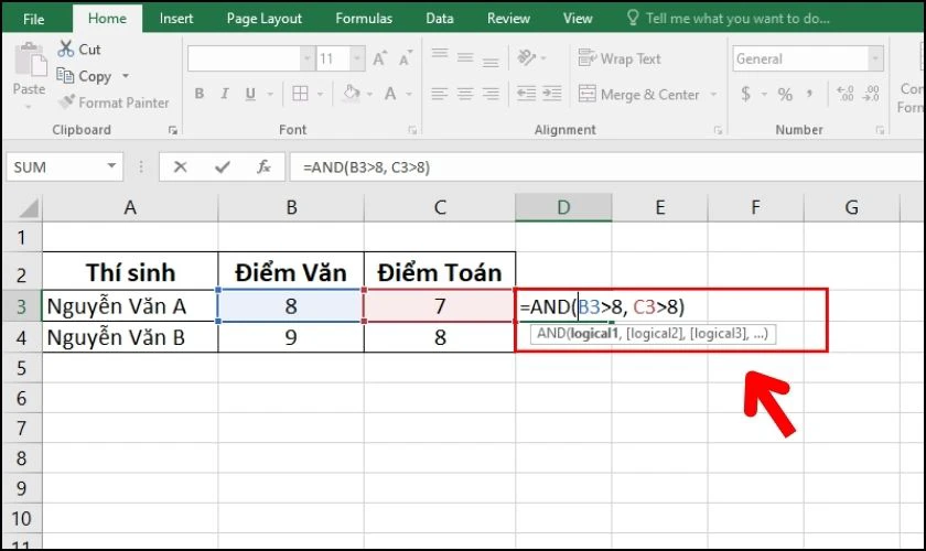 Trong đó B2 là điểm Toán, C2 là điểm Văn, D2 là điểm Anh. AND kiểm tra cả ba điểm cùng lúc, nếu có một môn dưới 8 điểm thì kết quả là “Chưa đạt”.