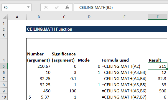 - =CEILING.MATH(-15.7, 5) trả về -15 (bội số 5 gần 0 nhất)