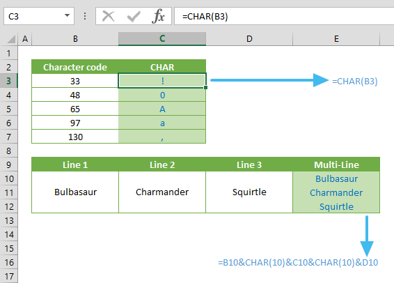 Ứng dụng phổ biến nhất của CHAR là tạo dấu xuống dòng. Thay vì gõ văn bản vào nhiều ô riêng biệt, bạn có thể hiển thị nhiều dòng trong một ô duy nhất.