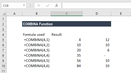 COMBINA tính số cách chọn các phần tử từ một tập hợp, trong đó cho phép chọn lặp lại cùng một phần tử nhiều lần. Đây là điểm khác biệt quan trọng so với hàm COMBIN thông thường.