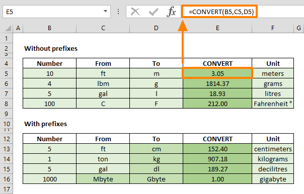 Ví dụ chuyển đổi 5 kilogram sang pound: =CONVERT(5,"kg","lbm") trả về 11.02. Cùng giá trị đó sang gram: =CONVERT(5,"kg","g") cho kết quả 5000.