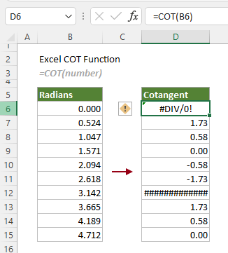 =COT(RADIANS(0)) ❌ Lỗi #DIV/0!