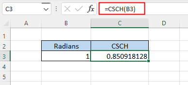 Ví dụ nhanh: Tính cosec hyperbol của 1 radian: =CSCH(1) → Kết quả: 0.8509181282