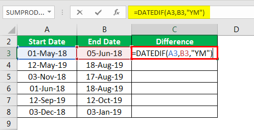 =DATEDIF(A2, B2, "YM")