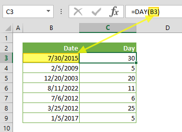- Tại ô đầu tiên của cột Ngày (C2), nhập =DAY(B2)