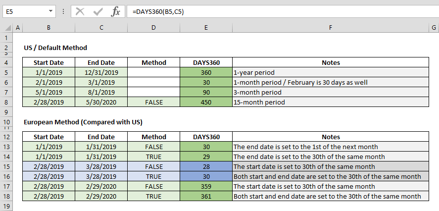 Sự khác biệt giữa hai phương pháp nằm ở cách xử lý ngày 31 và ngày cuối tháng 2. Phương pháp Mỹ điều chỉnh linh hoạt hơn còn phương pháp Châu Âu nghiêm ngặt hơn với quy tắc 30 ngày mỗi tháng.