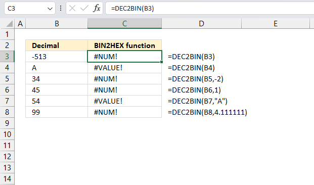 Nếu giá trị places nhỏ hơn số ký tự cần thiết cho kết quả nhị phân, hàm trả về lỗi NUM. Ví dụ, =DEC2BIN(255, 6) báo lỗi vì 255 cần ít nhất 8 ký tự để biểu diễn thành 11111111.