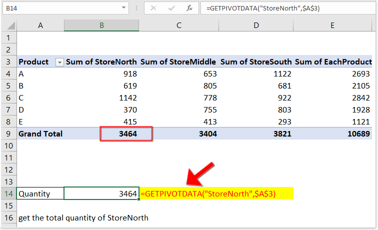 Ô tham chiếu nên là ô góc: Tham số thứ hai nên dùng ô đầu tiên góc trên bên trái của PivotTable, ví dụ A3. Nếu PivotTable thu nhỏ sau khi làm mới dữ liệu, ô góc này vẫn tồn tại. Dùng ô ở giữa có thể bị lỗi khi PivotTable thay đổi kích thước.