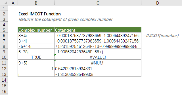 Hàm IMCOT trả về giá trị cotang của một số phức được biểu diễn dưới dạng chuỗi văn bản “x+yi” hoặc “x+yj”. Cotang của số phức được định nghĩa là nghịch đảo của hàm tang, tương đương với công thức IMDIV(IMCOS(z),IMSIN(z)).