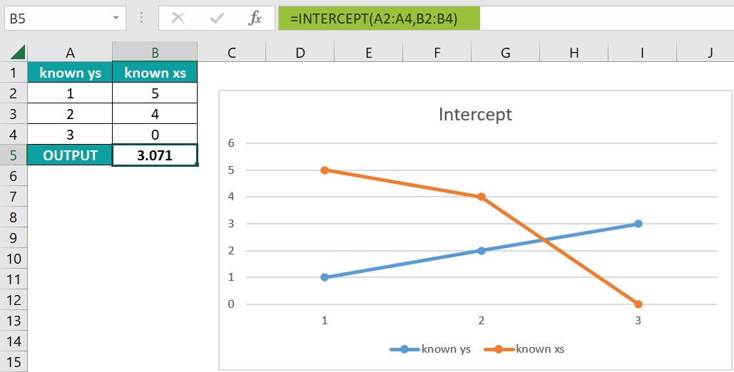 Intercept: =INTERCEPT(B2:B10, A2:A10)