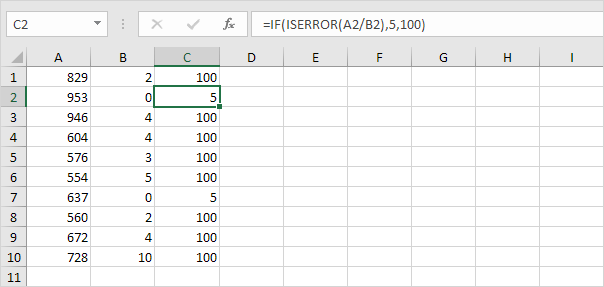 =IF(ISERROR(B2/C2), 0, B2/C2)