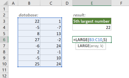 Hàm LARGE trả về giá trị lớn thứ k trong tập dữ liệu. Cú pháp đơn giản: =LARGE(array, k) với array là vùng dữ liệu và k là thứ hạng cần tìm.