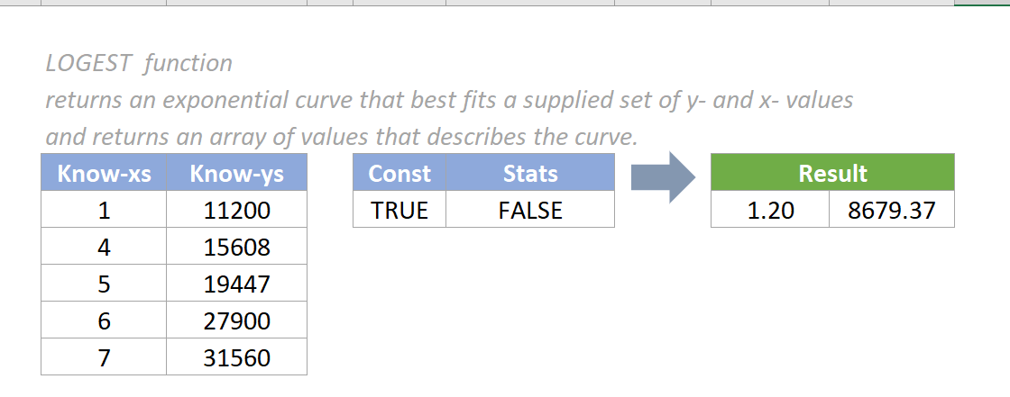 =LOGEST(known_y's, [known_x's], [const], [stats])