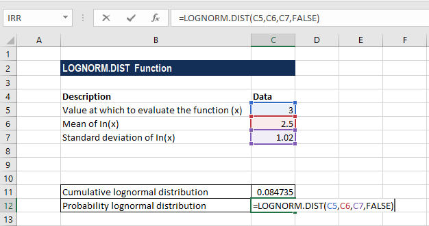 Trong đó mean và standard_dev là giá trị trung bình và độ lệch chuẩn của ln(x), không phải của x. Tham số cumulative nhận TRUE (hàm phân phối tích lũy) hoặc FALSE (hàm mật độ xác suất).