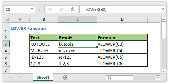 Hàm LOWER có một nhiệm vụ đơn giản: chuyển mọi chữ cái thành chữ thường. Cú pháp là =LOWER(text) trong đó text là ô chứa văn bản cần chuyển đổi. Hàm không ảnh hưởng đến số, dấu câu, hoặc ký tự đặc biệt.