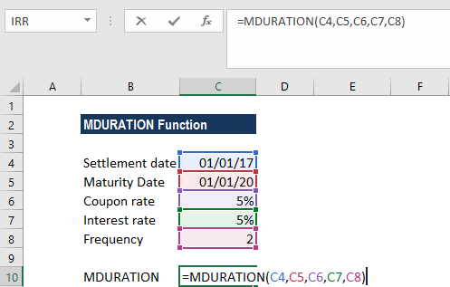 =MDURATION(settlement, maturity, coupon, yld, frequency, [basis])