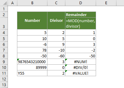Kết quả của hàm MOD luôn mang dấu giống với số chia. Nếu số chia là số dương thì kết quả dương, số chia âm thì kết quả âm. Công thức toán học đằng sau là MOD(n,d) = n – d*INT(n/d).