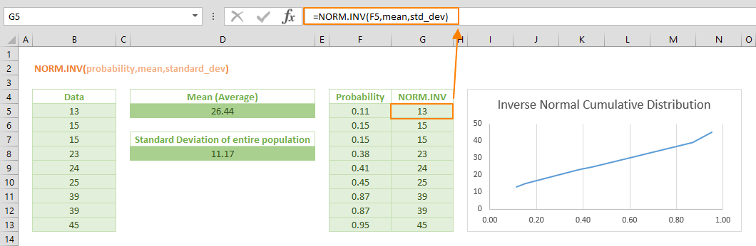 Hàm NORM.INV tính giá trị nghịch đảo của phân bố tích lũy chuẩn. Nghe có vẻ phức tạp, nhưng ý nghĩa đơn giản là: nếu bạn biết xác suất, hàm này sẽ cho bạn giá trị tương ứng trong phân bố.