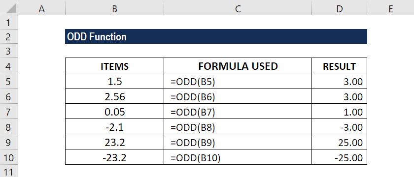 Ví dụ, ODD với giá trị 3.2 trả về 5. ODD với giá trị âm 3.2 trả về âm 5. Cả hai đều ra xa số 0. Nếu nhập 7, kết quả vẫn là 7 vì đã là số lẻ.