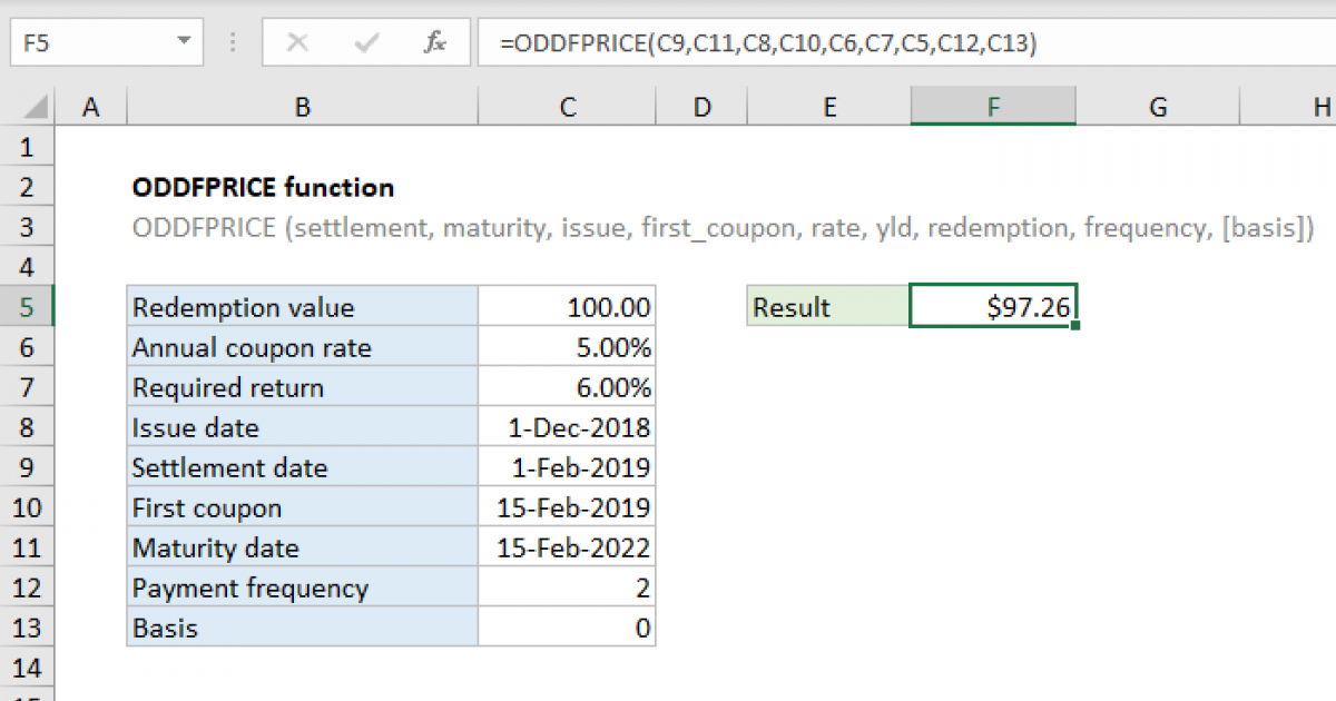 =ODDFPRICE(settlement, maturity, issue, first_coupon, rate, yld, redemption, frequency, [basis])