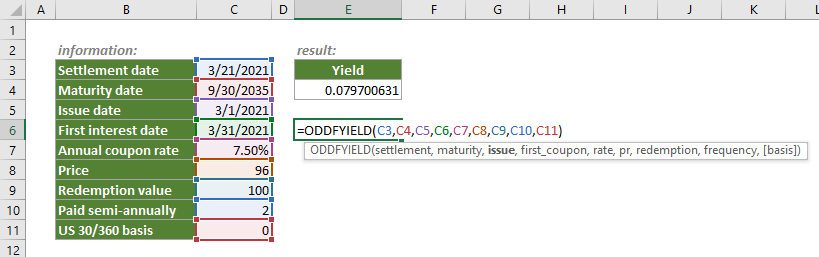 =ODDFYIELD(settlement, maturity, issue, first_coupon, rate, pr, redemption, frequency, [basis])