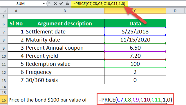=PRICE(settlement, maturity, rate, yld, redemption, frequency, basis)
