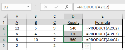 =PRODUCT(A1:A5,SUM(B1:B5),AVERAGE(C1:C5))