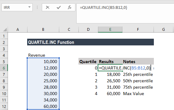 Tham số đầu tiên là phạm vi ô chứa dữ liệu số cần phân tích, ví dụ doanh số tháng của 50 nhân viên trong cột B2 đến B51. Tham số thứ hai là số nguyên từ 0 đến 4 chỉ định tứ phân vị nào bạn cần: