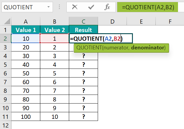 Bước 2: Nhập Công Thức QUOTIENT