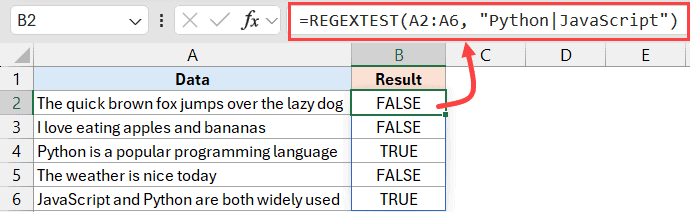 Hàm REGEXTEST kiểm tra xem một phần văn bản có khớp với mẫu biểu thức chính quy hay không. Kết quả trả về là TRUE nếu tìm thấy khớp và FALSE nếu không.