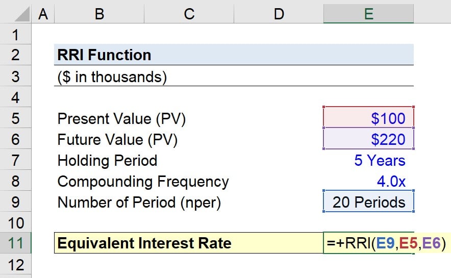 Hàm RRI trả về lãi suất cần thiết để một khoản đầu tư ban đầu đạt được giá trị mục tiêu trong một khoảng thời gian nhất định. Hàm này tính lãi kép theo chu kỳ và được giới thiệu từ Excel 2013.