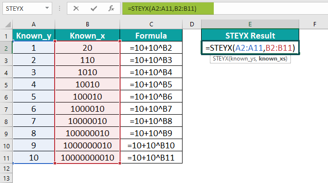 =STEYX(B2:B6, A2:A6)