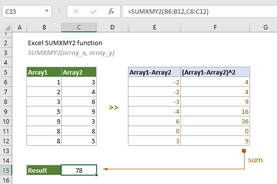 • SUMXMY2: SUM (tổng) + X (lấy X) + M (trừ Y trước) + Y2 (rồi mới bình phương)