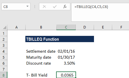 =TBILLEQ(DATEVALUE(A2), DATEVALUE(B2), C2)
