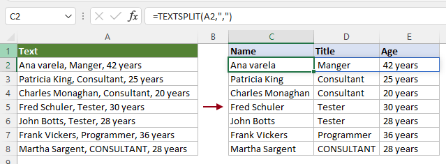 =TEXTSPLIT(A2,",")