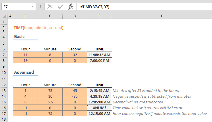 Ví dụ cụ thể: =TIME(14, 30, 0) trả về 2:30 chiều. =TIME(8, 45, 30) trả về 8:45:30 sáng.