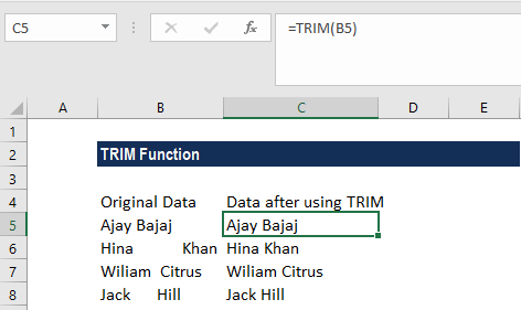 =TRIM(A2)(thay A2 bằng ô chứa dữ liệu) - Nhấn Enter và kéo xuống các ô còn lại