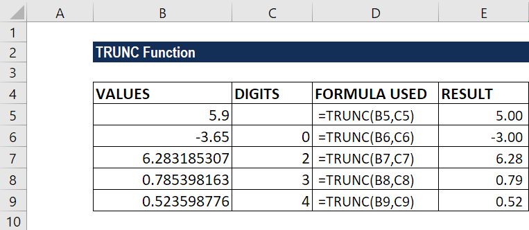 Nếu bỏ qua num_digits, Excel tự động đặt giá trị 0 và trả về số nguyên. Ví dụ, =TRUNC(78.549) trả về 78.