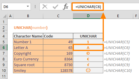 Hàm UNICHAR được giới thiệu trong Excel 2013 và hoạt động với một cú pháp đơn giản: =UNICHAR(số). Tham số duy nhất là mã số Unicode của ký tự bạn muốn hiển thị. Mã Unicode là hệ thống mã hóa ký tự quốc tế, gán một số duy nhất cho mỗi ký tự, biểu tượng hoặc emoji trên thế giới.