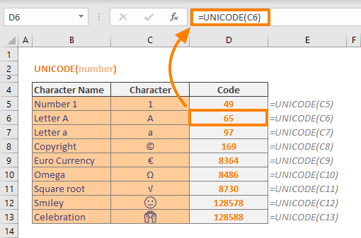 =UNICODE("A")trả về 65=UNICODE("a")trả về 97=UNICODE("Ạ")trả về 7840=UNICODE("Hello")trả về 72 (mã của chữ H)