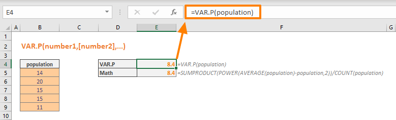 Cú pháp của VAR.P đơn giản và tương tự VARP. Điểm khác biệt chính là tên hàm rõ ràng hơn về mục đích sử dụng.