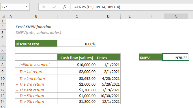 Công thức: =XNPV(0.08, B2:B5, A2:A5)