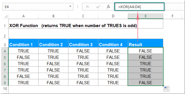 =XOR(TRUE, FALSE)trả về TRUE (một điều kiện đúng – số lẻ)=XOR(TRUE, TRUE)trả về FALSE (hai điều kiện đúng – số chẵn)=XOR(FALSE, FALSE)trả về FALSE (không có điều kiện nào đúng)